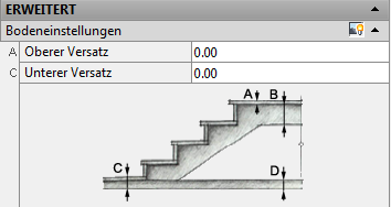 Anmerkung: Die Einstellungen für Tiefe (oben, unten) haben gegenwärtig keinen Einfluss auf Stufen und Wangen. Die Einstellung für den oberen Versatz hat keinen sichtbaren Einfluss auf die Stufe. Der untere Versatz verlängert bzw. verkürzt möglicherweise beigefügte Wangen. Beide Versatzwerte beeinflussen die Höhe von Boden zu Boden, falls diese angezeigt wird.