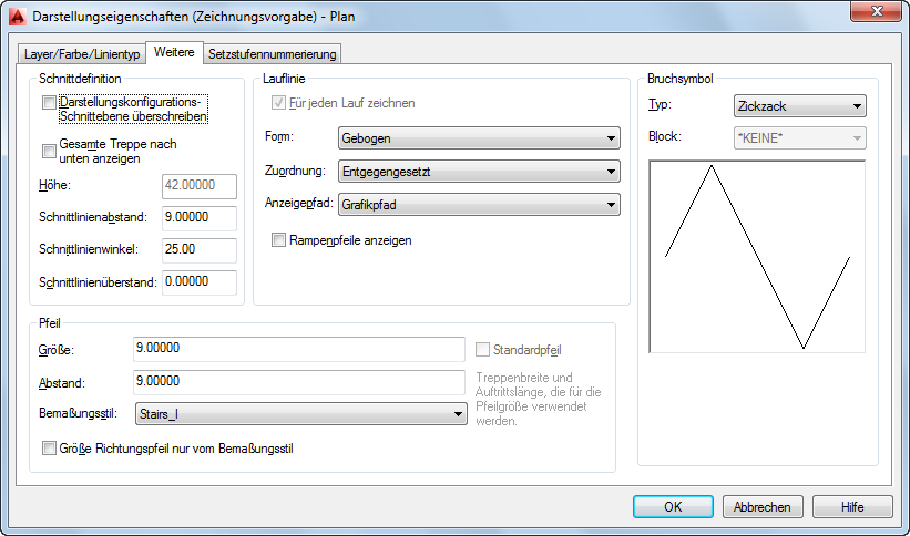 Bei Treppen, die in Versionen von Autodesk Architectural Desktop vor 2004 erstellt wurden, ist die Option Darstellungskonfigurations-Schnittebene überschreiben standardmäßig aktiviert. In der aktuellen Version ist diese Option standardmäßig deaktiviert und die Darstellung der Treppenkomponenten wird automatisch von spezifischen Darstellungskonfigurationen für jede Ebene übernommen.