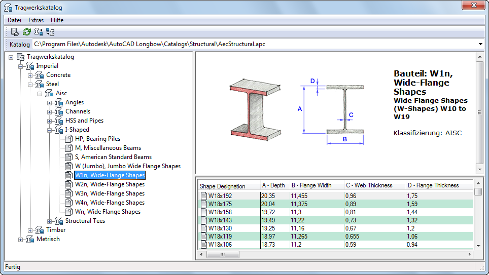 Um Stile für die meisten der vorgegebenen Unterzüge, Träger und Stützen zu erstellen, können Sie den Tragwerkskatalog verwenden, der in AutoCAD Architecture integriert ist. Der Katalog enthält industrieübliche Angaben für Beton-, Stahl- und Holz-Tragwerksformen, die in einer Windows® Explorer-ähnlichen Baumstruktur geordnet sind. Sie können den Katalog durchsuchen, eine Form wählen und einen Stil erstellen.