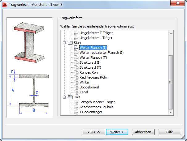 Wenn Sie den Typ, die Form sowie die Bemaßungen des zu erstellenden Tragwerks kennen, können Sie die Informationen rasch in den Tragwerkstil-Assistenten eingeben, um einen Stil zu erstellen. Sie können innerhalb eines Stils eine Tragwerksform erstellen, die auf einer beliebigen Form im Katalog basiert.