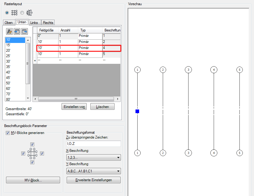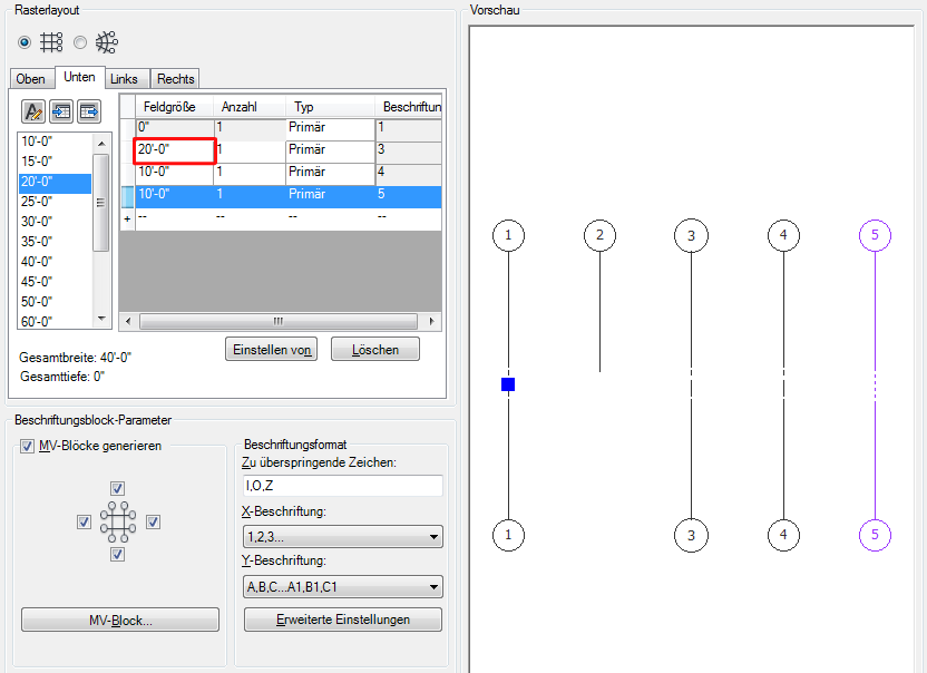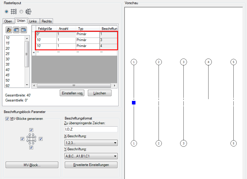 Nun überspannt das erste Feld unten zwei Felder, und Sie haben statt fünf Rasterlinien nur vier. Sie können nun entweder zur Registerkarte Links wechseln, um die Rasterachse zu bearbeiten, oder Sie drücken die EINGABETASTE, um das Raster in der Zeichnung zu platzieren.