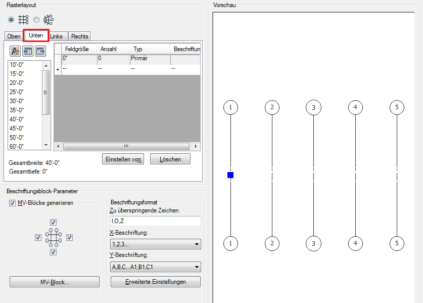 Jetzt haben Sie einen unvollständigen Satz von Rasterfeldern für die Registerkarte Unten. Wenn dies bereits der gewünschten Konfiguration entspricht (wie im Beispiel unten), können Sie das Raster entweder in der Zeichnung platzieren oder zu den Registerkarten Links oder Rechts wechseln, um die horizontalen Linien zu definieren.