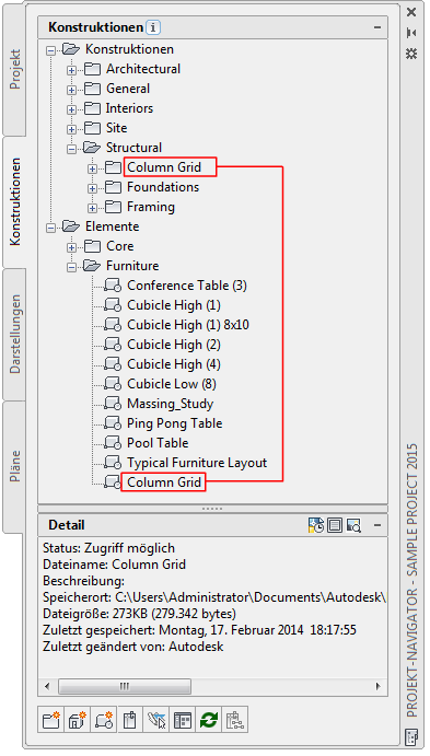 - Ziehen Sie die Konstruktion nicht in Windows Explorer auf den Elemente-Ordner, da dies unter Umständen zu Inkonsistenzen bei den Projektdaten führt.