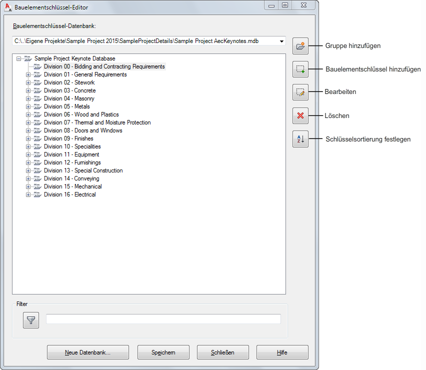 Beim Bauelementschlüssel-Editor handelt es sich um eine eigenständige Anwendung, mit der Sie Bauelementschlüssel-Datenbanken erstellen und bearbeiten können. Der Bauelementschlüssel-Editor wird über das Menü CAD-Manager geöffnet und enthält die eine hierarchische Baumstruktur der aktuell ausgewählten Datenbank, die als Stammknoten angezeigt wird. Bei bestehenden Datenbanken können Sie den Stammknoten erweitern und Gruppen anzeigen, die wiederum erweitert werden können, um Untergruppen oder einzelne Bauelementschlüssel anzuzeigen. Sie können auch Text in das Feld Filter unterhalb der Baumstruktur eingeben. Klicken Sie auf die Schaltfläche Filter, drücken Sie die TABULATORTASTE, oder drücken Sie die EINGABETASTE, um die Anzeige der Knoten unter einem bestimmten Knoten zu erweitern, der die eingegebene Zeichenfolge enthält.