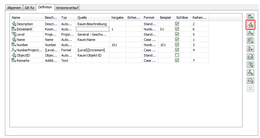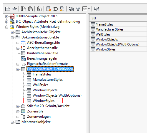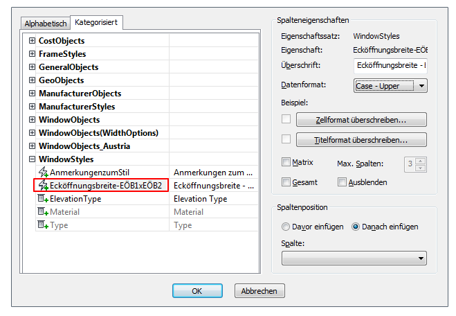 Gehen Sie folgendermaßen vor, um die automatischen Eigenschaften in der Fensterbauteilliste zu ändern: