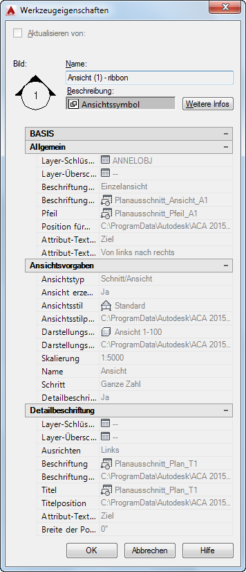 Pfeil | Schnitt/Ansicht | Legen Sie hier den Block für den Schnittlinien- bzw. Ansichtssymbolpfeil fest. |