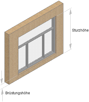 Sturz/Brüstung steuert die Art der Platzierung einer Tür-Fenster-Kombination in der Wand sowie die Konsequenzen, die sich bei Änderungen der Höhe für die Tür-Fenster-Kombination ergeben. Mit den Optionen Brüstungshöhe und Sturzhöhe können Sie den Arbeitspunkt der Tür-Fenster-Kombination bestimmen. Sie können den Arbeitspunkt an der Oberkante der Brüstung oder Unterkante des Sturzes setzen. Der Wert für Sturz/Brüstung bestimmt die vertikale Position des Arbeitspunkts auf der Wand.