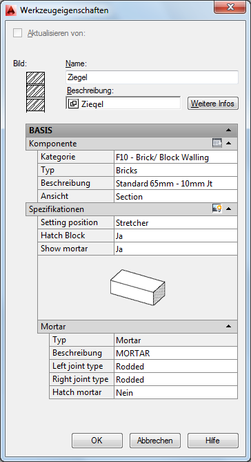 Das Aussehen des Arbeitsblatts Werkzeugeigenschaften hängt vom Typ der Komponente und den aktuellen Eigenschaftseinstellungen ab. Die folgenden Abbildungen zeigen zwei Konfigurationen des Arbeitsblatts Werkzeugeigenschaften für das auf der Musterwerkzeugpalette Basic enthaltene Werkzeug 04 - Masonry. Mit dem Werkzeug werden in beiden Fällen vorgabemäßige 3/8'' Ziegel mit Fugen hinzugefügt, jedoch ist bei der ersten Konfiguration für die Eigenschaft Ansicht der Wert Schnitt festgelegt, wogegen bei der zweiten Konfiguration für diese Eigenschaft der Wert Elevation (Pattern) definiert ist. Bei Detailkomponenten, die unterschiedlich in den einzelnen Ansichten ausgerichtet werden können, bestimmt die Einstellung Ansicht die Zeichnungsroutine, die zum Einfügen des Bilds in die Zeichnung verwendet wird. Beachten Sie, dass die unterschiedlichen Einstellungen für Ansicht zu unterschiedlichen Ausrichtungsdarstellungen auf dem Arbeitsblatt führen. Beachten Sie, dass die Mörtelspezifikationen nicht für die Einstellung Elevation (Pattern) gelten und daher auch nicht in der Konfiguration angezeigt werden. Die unter Spezifikationen angezeigten Eigenschaften hängen von anderen Einstellungen ab. Wenn beispielsweise für die Eigenschaft Show Mortar der Wert Nein und für die Einstellung Ansicht der Wert Schnitt ausgewählt ist, werden keine anderen Mörteleigenschaften angezeigt. Bei einigen anderen Detailkomponenten sind möglicherweise keine Spezifikationen vorhanden; die Überschrift wird dann nicht angezeigt.