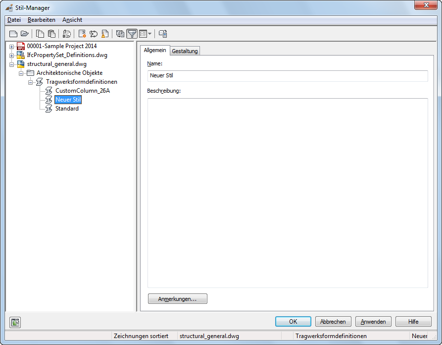 Im Stil-Manager wird der Ordner Architektonische Objekte geöffnet und Tragwerksformdefinitionen ausgewählt.