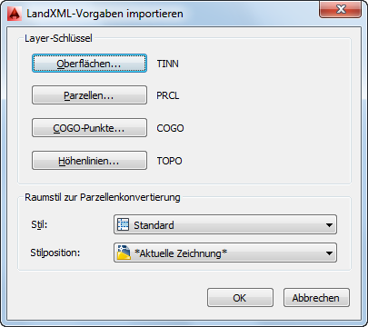 Wenn Sie keine bestimmten Layer-Schlüssel für die LandXML-Daten definieren, werden die importierten Daten den für LandXML-Daten, TINN (Oberflächen), PRCL (Parzellen), COGO (COGO-Punkte) und TOPO (Höhenlinien) vorgegebenen Layer-Schlüsseln zugeordnet.