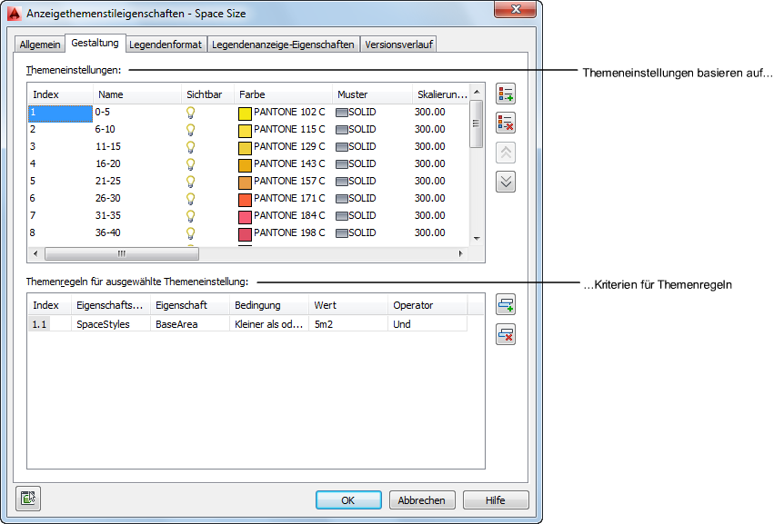 Die Legende eines Anzeigethemas ist der Schlüssel, mit dem bestimmte Farben, Füllungen oder Schraffuren den Eigenschaften von Objekten in der Zeichnung zugeordnet werden. Sie fügen eine Anzeigethemenlegende in eine Zeichnung ein, um ein Anzeigethema zu aktivieren und die Darstellung von Objekten zu ändern, indem Sie die aktuellen Darstellungseigenschaften außer Kraft setzen.