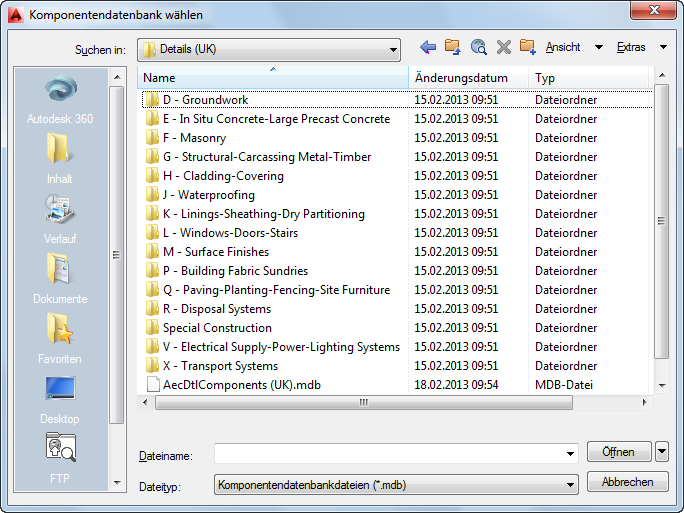 Gehen Sie wie folgt vor, um eine neue Datenbank der Liste der aktiven Detailkomponenten-Datenbanken hinzuzufügen, aus denen die Komponenten eingefügt, in eine Werkzeugpalette kopiert oder zum Ändern eines vorhandenen Werkzeugs verwendet werden können.