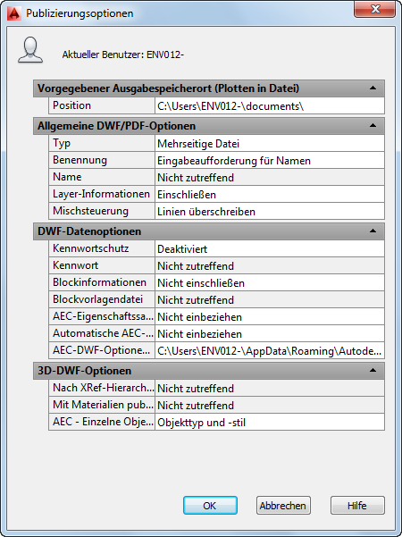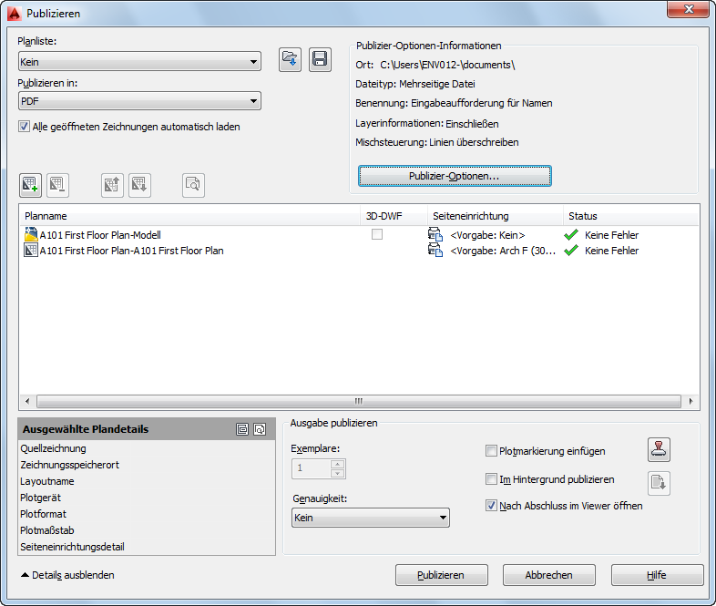 Sie können angeben, dass Zeichnungen beim Speichern oder Schließen automatisch im PDF-Format (oder DWF- bzw. DWFx-Format) veröffentlicht werden. Beim Festlegen der Einstellungen für das automatische Publizieren können Sie außerdem angeben, ob Modelle, Layouts oder beides eingeschlossen werden und ob eine ein- oder mehrseitige Datei publiziert wird.