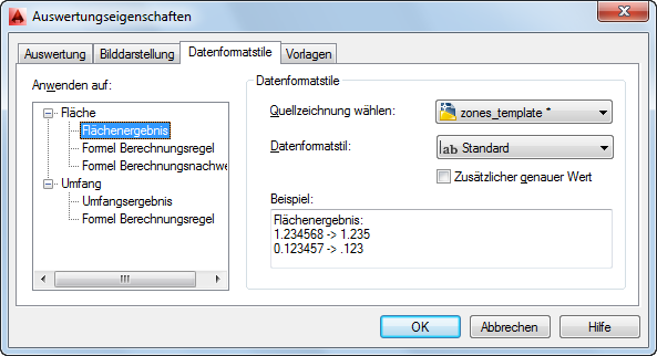 - Wählen Sie für Flächenergebnis und Umfangsergebnis die Option Zusätzlicher genauer Wert aus, wenn Sie die genauen, nicht gerundeten Werte als zusätzliche Informationen in die Auswertungsdatei einbeziehen möchten.
