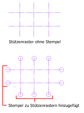 Anmerkung: Beim Hinzufügen einer Rasterlinie zu einem vorhandenen benutzerspezifischen Stützenraster werden Beschriftungen mit dem vorgegebenen Wert '-' ohne Unterstützung durch das automatische Beschriften automatisch generiert. Wenn Sie eine Rasterlinie entfernen, wird die automatische Beschriftung nicht unterstützt.