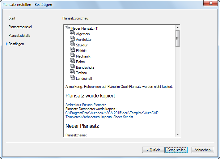 Erstellen der Plansatzvorlage abschließen | Klicken Sie auf Fertig stellen. |