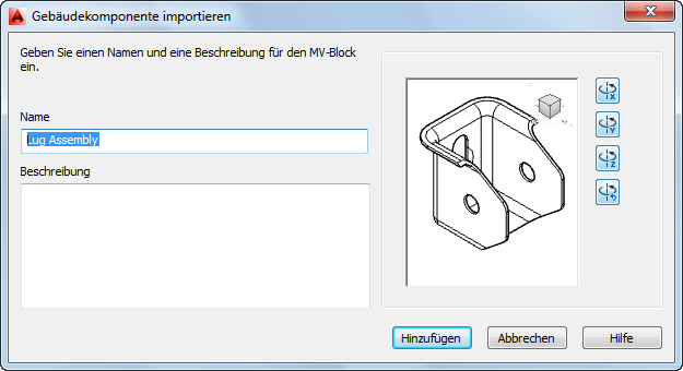 Hierdurch wird das Dialogfeld zum Importieren geöffnet, in dem Sie während des Einfügens einen Namen und eine Beschreibung für den Block oder MV-Block eingeben oder die Ausrichtung des Blocks oder MV-Blocks ändern können.