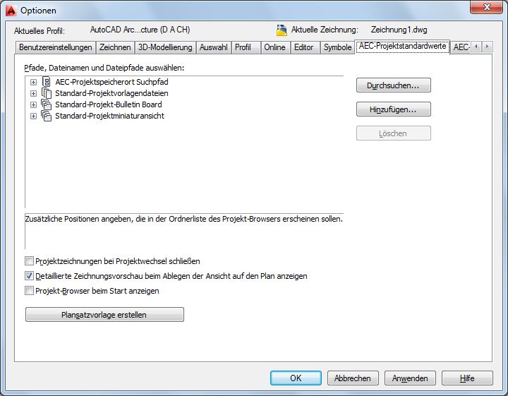 Verwenden Sie diese Vorgehensweise, um die Vorgabeoptionen für Ihre AutoCAD Architecture-Projekte zu definieren. Folgende Optionen können für Projekte festgelegt werden: