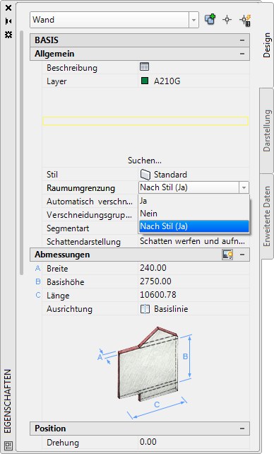 - Zeigen Sie in der Eigenschaftenpalette die Einstellung Raumumgrenzung wie folgt an: