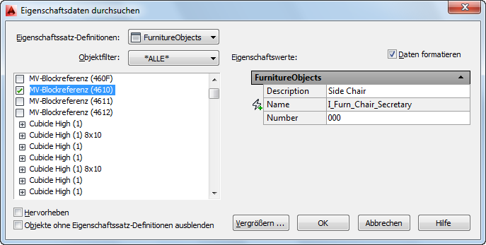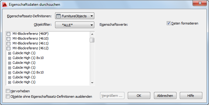 Gehen Sie wie folgt vor, um auf die Daten für alle Eigenschaftssätze in einer Zeichnung zuzugreifen und diese anzuzeigen.