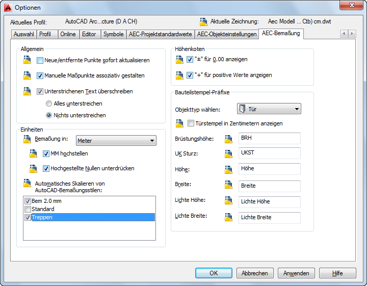 Zu den Einstellungen für AEC-Bemaßungen zählen: