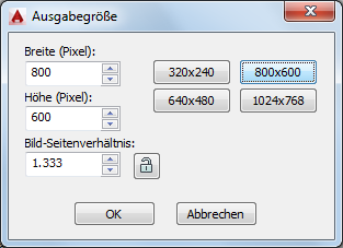 Wenn Sie eine eindeutige Ausgabegröße festlegen, wird sie zur Liste Ausgabegröße der Palette Render-Einstellungen hinzugefügt. In die Liste der Ausgabegrößen können vier verschiedene Ausgabegrößen aufgenommen werden. Diese werden jedoch nicht mit der aktuellen Zeichnung gespeichert und nicht zwischen den Zeichnungssitzungen beibehalten.