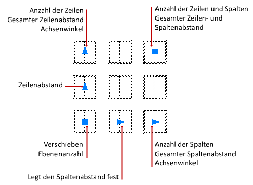 Durch Ziehen der Griffe der Anordnung können Sie die Anzahl und den Abstand der Zeilen und Spalten in der Anordnung erhöhen und verringern.
