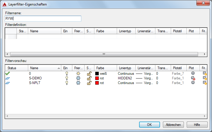 Dieses Beispiel zeigt eine Layerfilterdefinition, die im Dialogfeld Layerfilter-Eigenschaften eingerichtet wird.