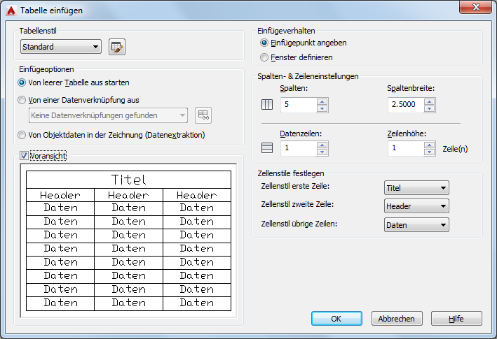 Wählen Sie innerhalb der aktuellen Zeichnung einen Tabellenstil für das Erstellen der Tabelle aus. Sie können einen neuen Tabellenstil erstellen, indem Sie auf die Schaltfläche neben der Dropdown-Liste klicken.