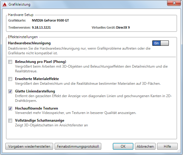 Mit diesen Einstellungen werden die Hardwarebeschleunigungseffekte, die von der Grafikkarte des Systems bereitgestellt werden, sowie die Leistungseinstellungen für die Software kontrolliert.