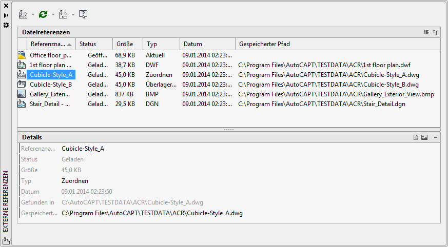- Zeigt eine Liste der Referenzen in der aktuellen Zeichnung an, einschließlich Informationen wie Status, Größe und Erstellungsdatum.