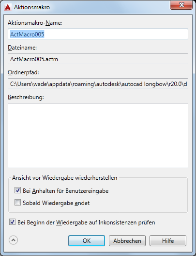 Gibt einen Namen für das aktuelle Aktionsmakro an. Geben Sie einen neuen Namen ein, um den angezeigten Vorgabenamen zu ersetzen.