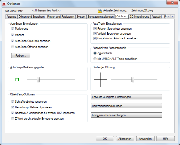 Legt die Optionen für verschiedene Bearbeitungsfunktionen fest, einschließlich AutoSnap und AutoTrack.