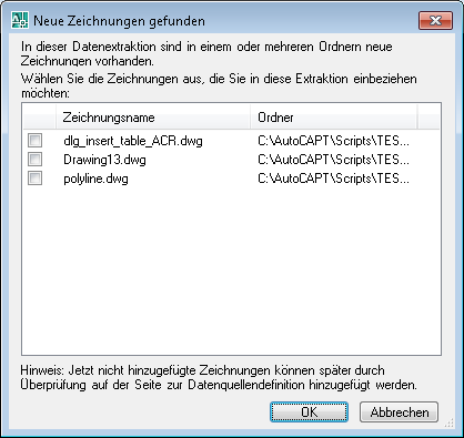 Zeigt eine Liste der neuen Zeichnungen an, die dem Ordner hinzugefügt wurden, der für die Datenextraktion ausgewählt wurde, nachdem diese ausgeführt wurde.