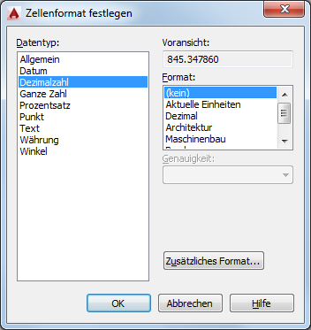 Abhängig vom ausgewählten Datentyp wird eine Liste relevanter Formattypen angezeigt. Wenn Sie beispielsweise Winkel als Datentyp auswählen, sind unter Format Optionen wie Dezimalgrad, Grad, Bogenmaß usw. verfügbar.