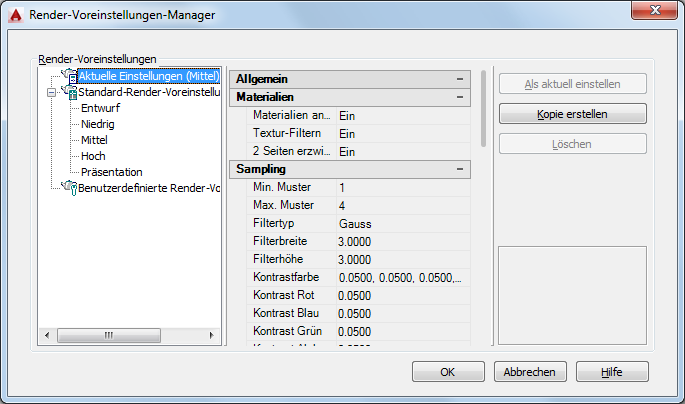 Zeigt eine Strukturansicht an, in der alle in der aktuellen Zeichnung gespeicherten Voreinstellungen aufgeführt sind. Es gibt zwei Arten von Render-Voreinstellungen: Standard und Benutzerdefiniert.