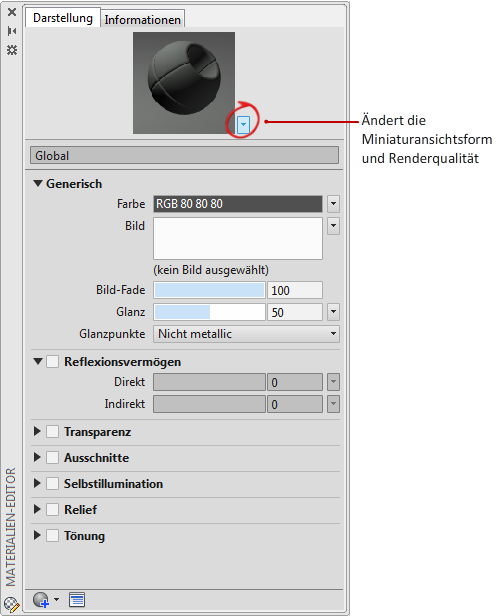 Bearbeiten Sie ein vorhandenes Material (aus der Autodesk-Materialbibliothek), oder beginnen Sie mit einem allgemeinen Material. Die Änderungen werden in der Voransicht des Materialmusters angezeigt. Sie können die Form des Bildes ändern, das in der Voransicht angezeigt wird.