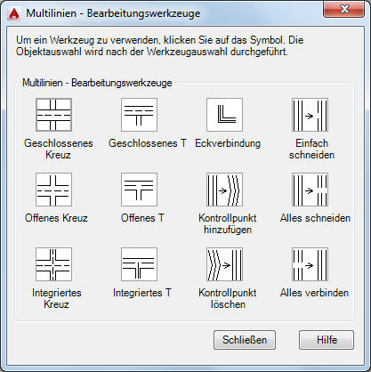 Dieses Dialogfeld enthält Werkzeuge und Voransichten in vier Spalten. Die erste Spalte steuert Multilinien mit Schnittpunkten, die zweite Spalte Multilinien in T-Form, die dritte Eckverbindungen und Kontrollpunkte und die vierte Unterbrechungen in Multilinien.