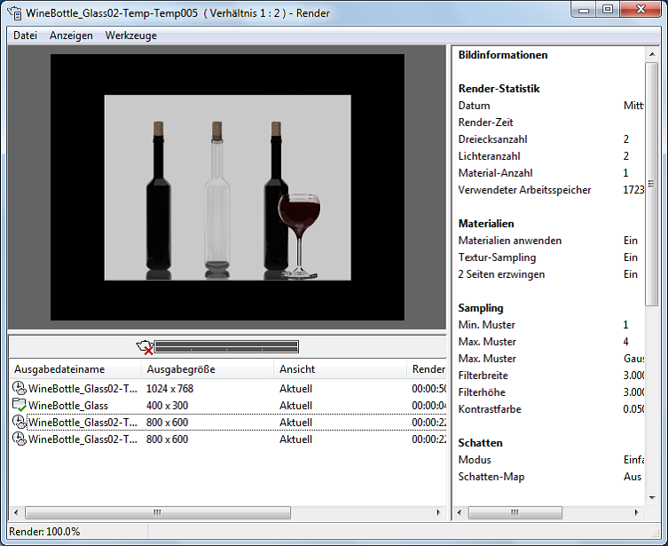 Wenn Sie das Renderfenster erneut öffnen, ist das Protokoll der früheren Renderings weiterhin verfügbar.