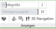 - Wählen Sie eine oder mehrere Punktwolken aus. Klicken Sie in der kontextabhängigen Registerkarte Punktwolke auf die Gruppe Anzeigen, und stellen Sie den Schieberegler für die Punktgröße auf den gewünschten Wert ein. Um die Detailgenauigkeit zu reduzieren und den Anzeigevorgang zu beschleunigen, legen Sie einen höheren Punktgrößenwert fest.