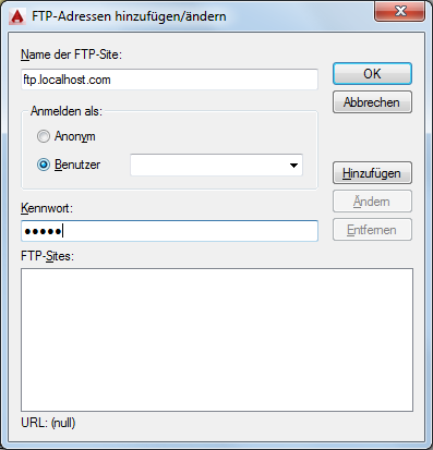 Um das Dialogfeld FTP-Adressen hinzufügen/ändern aufzurufen, wählen Sie in einem Standarddialogfeld zur Dateiauswahl die Option Extras  FTP-Adressen hinzufügen/ändern.