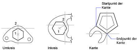 Die folgenden Abbildungen zeigen Polygone, die mithilfe von drei Methoden erstellt wurden: Inkreis, Umkreis und Kante. In jedem Fall werden zwei Punkte angegeben.