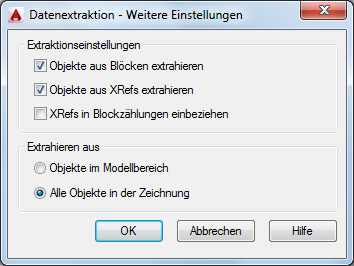 Enthält Optionen zum Extrahieren von Objekten in verschachtelten Blöcken und XRef-Blöcken, Optionen für Blockzählungen sowie Optionen zum Festlegen, ob alle Objekte oder nur der Objekte im Modellbereich extrahiert werden sollen.