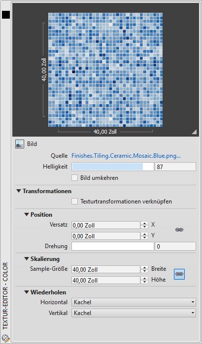 Die Textureinstellungen steuern verschiedene Aspekte von Texturen für Materialien, z. B. Position, Skalierung, Größe und Wiederholung. Manche Einstellungen sind mehreren Texturen gemeinsam. Andere sind für einen Texturtyp spezifisch.