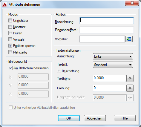 Die Vorgabewerte werden in der Systemvariable AFLAGS gespeichert. Eine Änderung der Einstellungen für AFLAGS wirkt sich auf den Vorgabemodus für neue Attributdefinitionen aus und nicht auf vorhandene Attributdefinitionen.