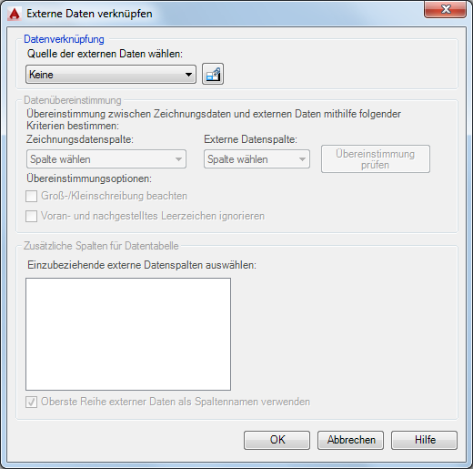 Vergleicht die Daten der Datenschlüsselspalte in der angegebenen Zeichnung mit den Daten der externen Datenschlüsselspalte. Wenn die Daten aller Zeilen der externen Datenschlüsselspalten eindeutig sind und mindestens eine Übereinstimmung zwischen den Zeichnungsdaten und den Daten in der Tabelle gefunden wurde, wird eine Meldung angezeigt, die eine erfolgreiche Prüfung des Schlüssels bestätigt. Sollte die Prüfung des Schlüssels nicht erfolgreich durchgeführt worden sein, wird eine entsprechende Warnmeldung ausgegeben.