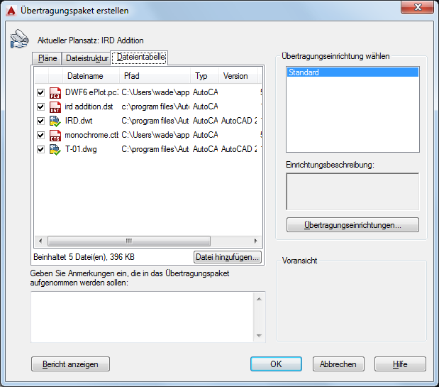 Zeigt Berichtsdaten an, die Bestandteil des Übertragungspakets sind. Dazu gehören alle Übertragungshinweise, die Sie eingegeben haben, sowie alle automatisch erstellten Verteilungshinweise. In den Verteilungshinweisen werden die Schritte beschrieben, die für eine korrekte Funktionsweise des Übertragungspakets durchgeführt werden müssen. Beispiel: Wenn eine Übertragungszeichnung SHX-Schriften enthält, wird angegeben, wohin Sie die Dateien kopieren müssen, damit diese in dem System, auf dem das Übertragungspaket installiert wird, erkannt werden. Wenn Sie eine Textdatei mit Vorgabeanmerkungen erstellt haben, werden diese Anmerkungen ebenfalls in den Bericht einbezogen.