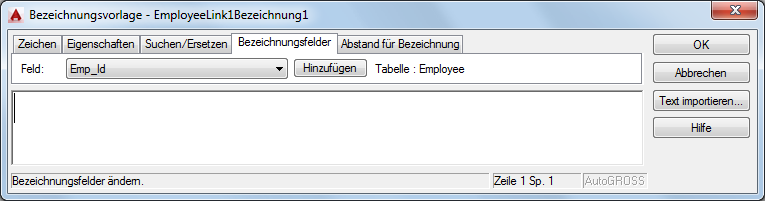 Zeigt eine Liste aller verfügbaren Felder aus der aktuellen Datenbank an, die Sie in die gewünschte Bezeichnung einfügen können. Sie können beliebig viele Felder aus der Quelltabelle verwenden.