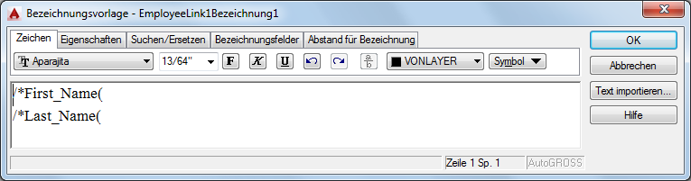 Vorgabemäßig wird Text mit einem Zirkumflex (^) in linksbündige Toleranzwerte umgewandelt. Wenn Sie Bruchzahlen eingeben, wird der Schrägstrich in einen Bruchstrich umgewandelt, der die Länge der längeren Zeichenfolge hat. Text mit einer Raute wird in einen Bruch mit einer diagonalen Linie umgewandelt, die so hoch ist wie die beiden Zeichenfolgen. Die Zeichen über der diagonalen Linie werden unten rechts ausgerichtet, die Zeichen unter der Linie dagegen oben links.