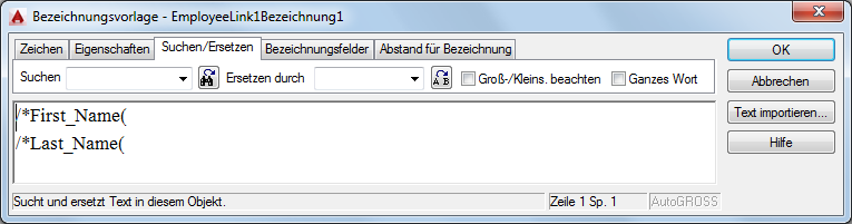 Sucht in der Bezeichnungsvorlage nach bestimmten Textzeichenfolgen und ersetzt sie durch neuen Text.